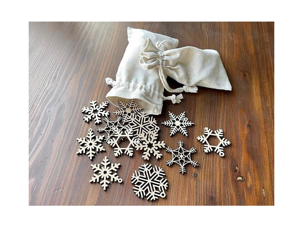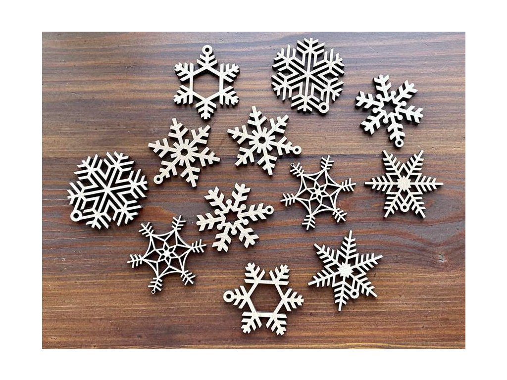 Dvanáct dřevěných vloček, kterými můžete ozdobit vánoční stromeček, nebo větvičky ve váze.